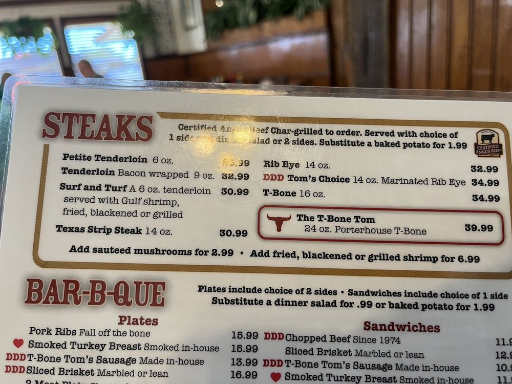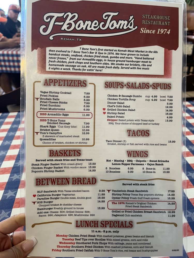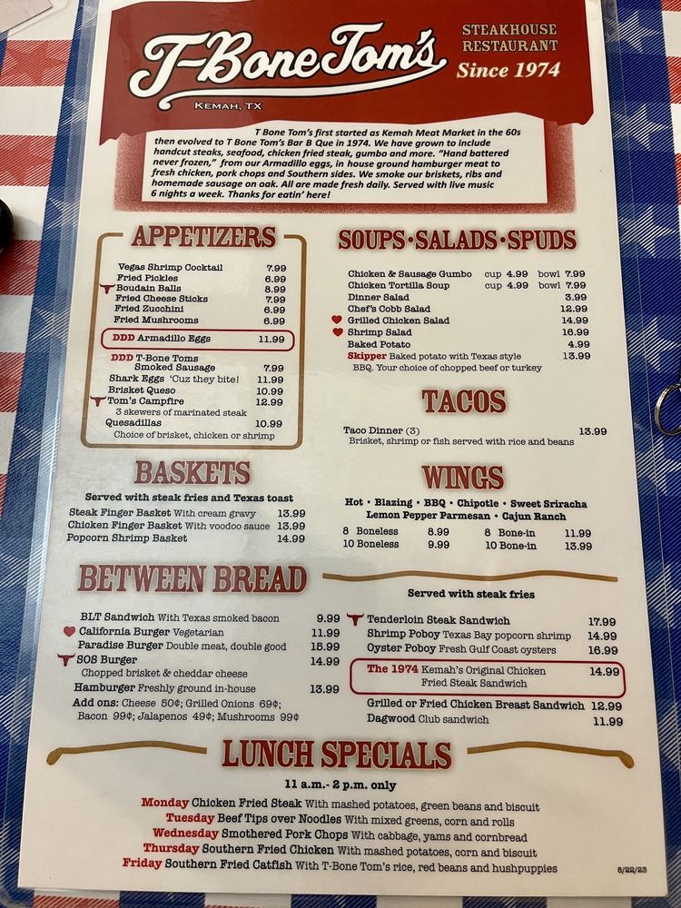 T-Bone Tom's is a popular spot in Kemah, TX known for its steaks, barbeque, and American cuisine. They offer a variety of menu options, including keto and vegetarian choices. The restaurant provides a casual dining experience with outdoor seating, a full bar, and happy hour specials. Customers rave about the friendly service and the tasty food, such as the fried pickles, brisket tacos, and Louisiana gumbo. The armadillo eggs are a must-try, with guests praising their unique flavor. With a diverse menu and vibrant atmosphere, T-Bone Tom's is a great choice for a delicious meal with friends and family.